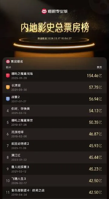 目前在内地影史票房榜单前十中,除了《疯狂动物城2》,其余均为国产影片。排名第一的是《哪吒之魔童闹海》,票房高达154.46亿元。该片由可可豆动画、光线彩条屋影业出品,饺子编剧并执导,于2025年1月29日在中国大陆上映,上映后创下多项纪录,包括亚洲首部票房破百亿元(人民币)电影、亚洲首部票房破20亿美元电影、全球动画电影票房榜冠军等。